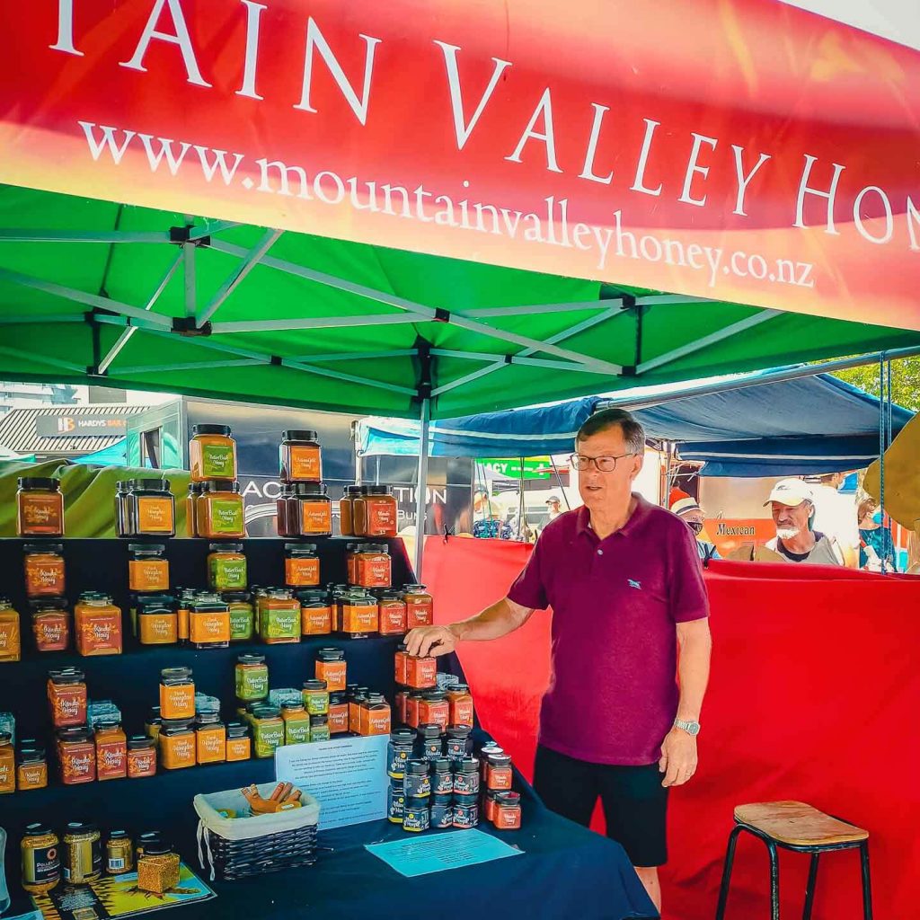 Larry reckons it takes him nearly an hour to set up the gazebo and unpack our range of New Zealand honey. That’s mostly thanks to the constant stream of banter and good-natured ribbing between the surrounding stallholders.